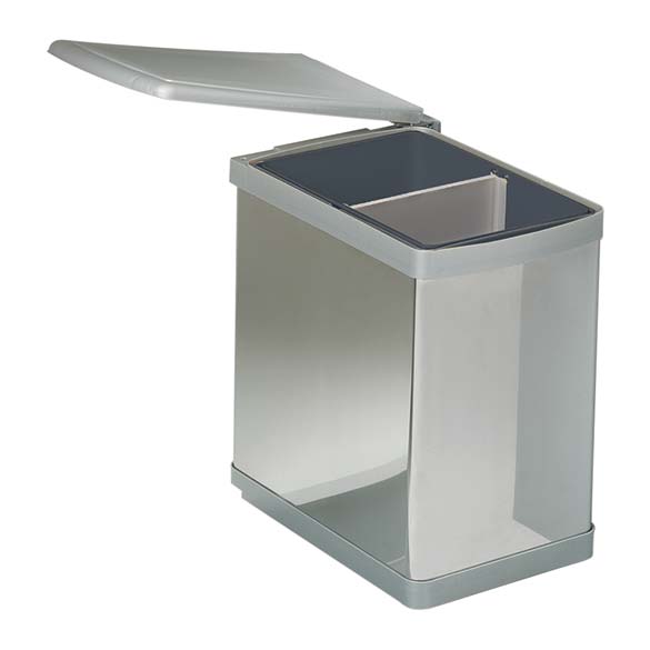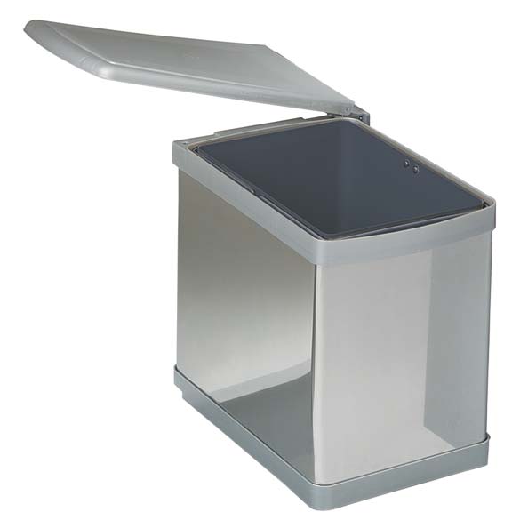 Door mounted waste bin with stainless steel outer body and metallic grey plastic inserts.