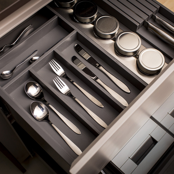The Première Collection of wooden cutlery trays is extremely versatile and has been designed to offer a practical soution to keeping cutlery and other kitchen tools tidy inside the drawers.