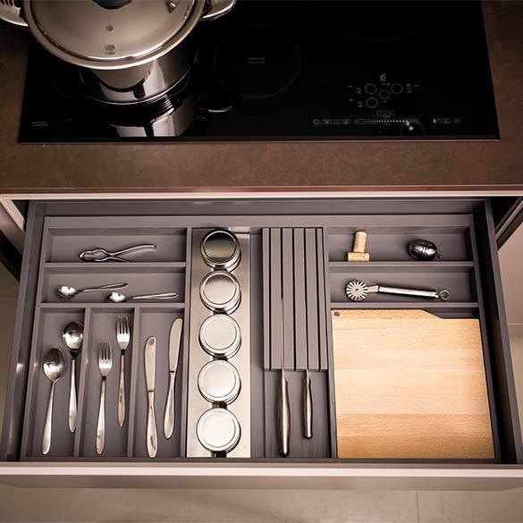 Première Collection cutlery trays are made of ash wood with open-pore finish. Each cutlery tray is equippable with dividers to simplify the storage and additional accessories such as chopping board, knife holder and film dispenser.