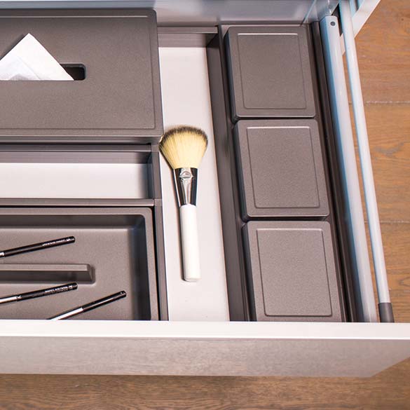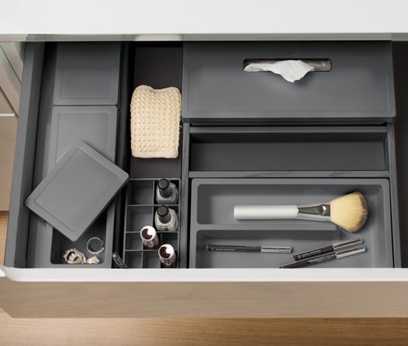 Each grid can be equipped with tissue box, small tray, cosmetic holder and small boxes with lid (the selection of accessories varies according to the combination of widths and depths).
