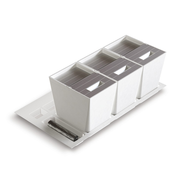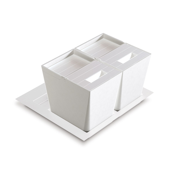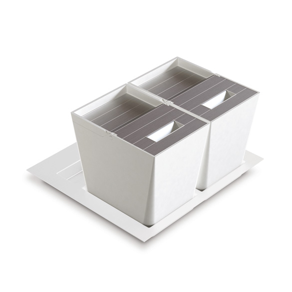 Waste bins for large drawer with matt finish plastic lids.