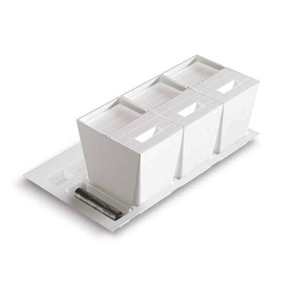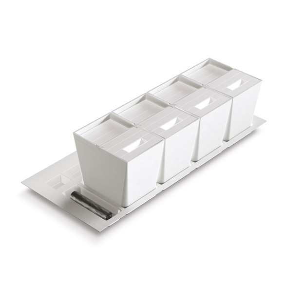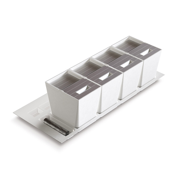 The tray hosting the bins can be cut to size and stainless steel depth compensators for greater depths are also available.