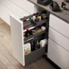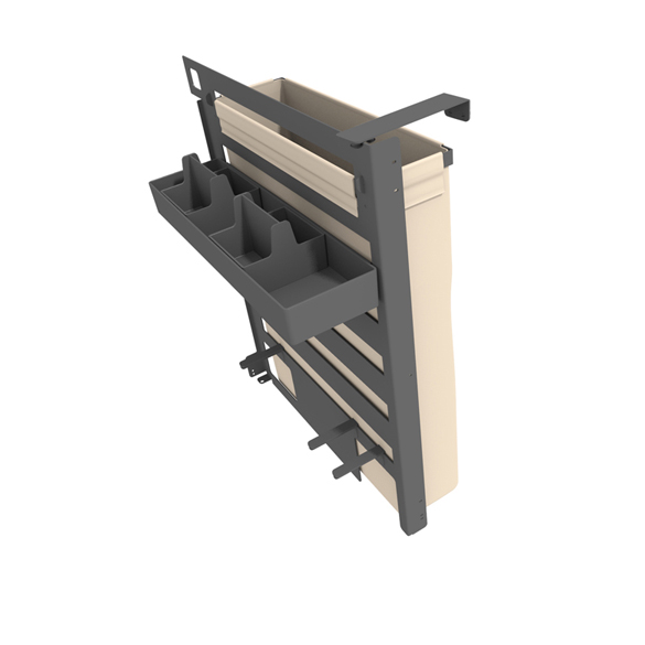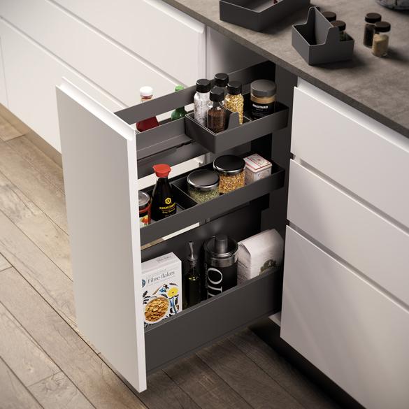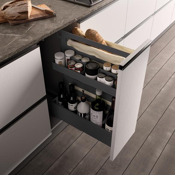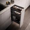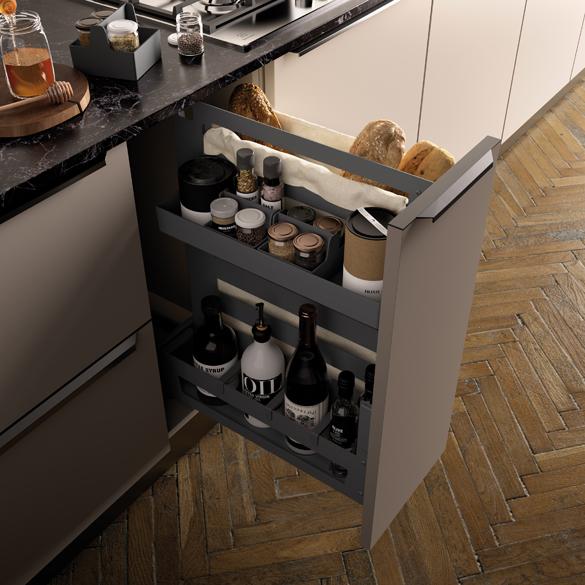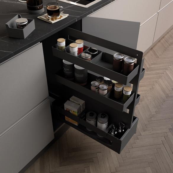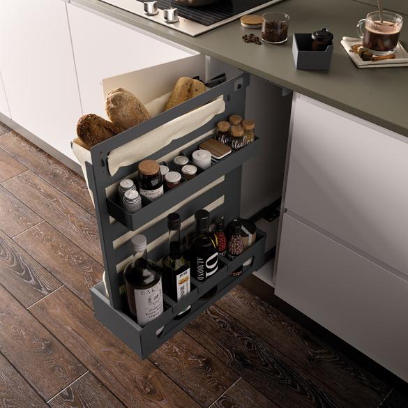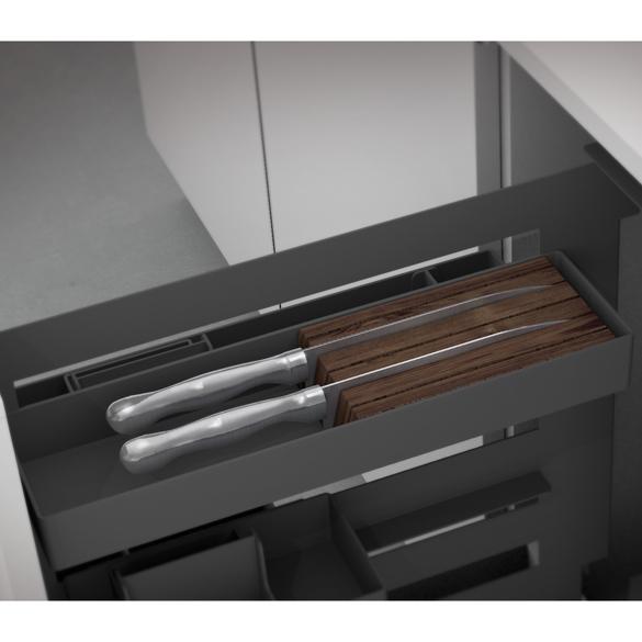 Sous-Chef is the latest innovative solution from Gollinucci designed to organize internal kitchen spaces. Equipped with adjustable compartments, the product allows for easy access for all cooking ingredients, accessories and cutlery. In addition to orion grey, the product is also available with a knife holder (in walnut finish), and can be used in cabinets from 150mm-600mm. The product is suitable both for cabinets with standard doors and for the most common types of drawer (Blum®, Grass®, Hettich®, FGV®…).
