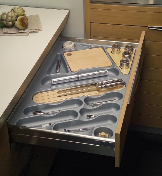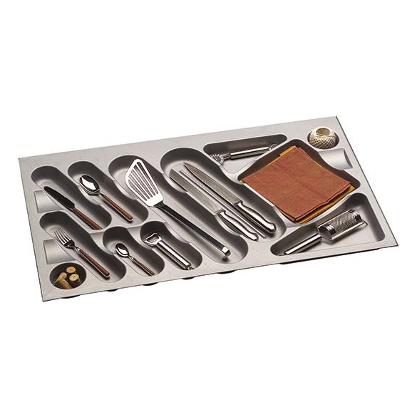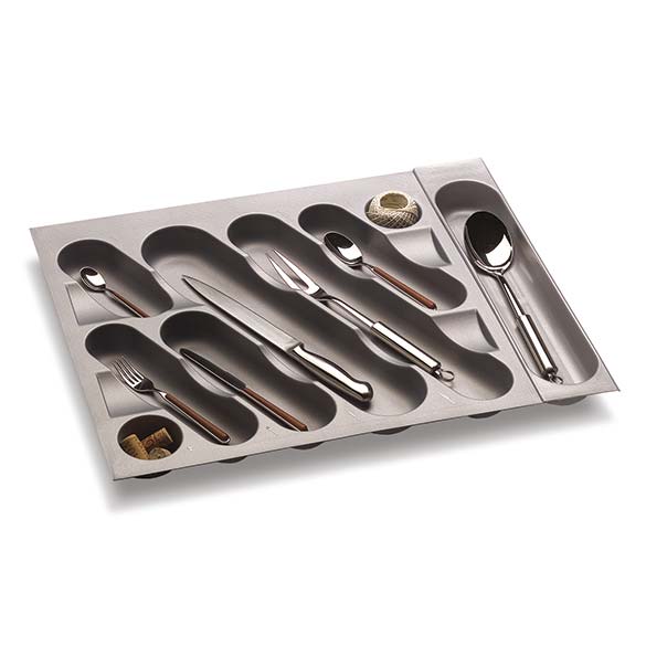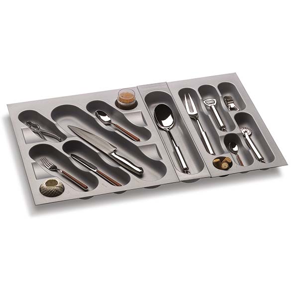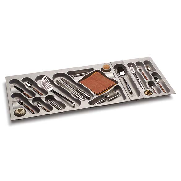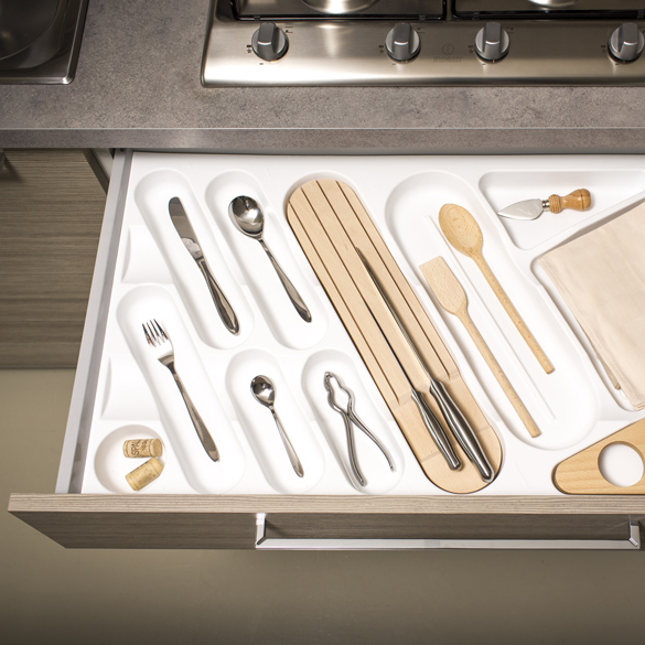 Possibilité d’équiper les range-couverts en les rendant plus fonctionnels avec accessoires optionnels comme porte-couteaux, planche à découper et porte-épices.