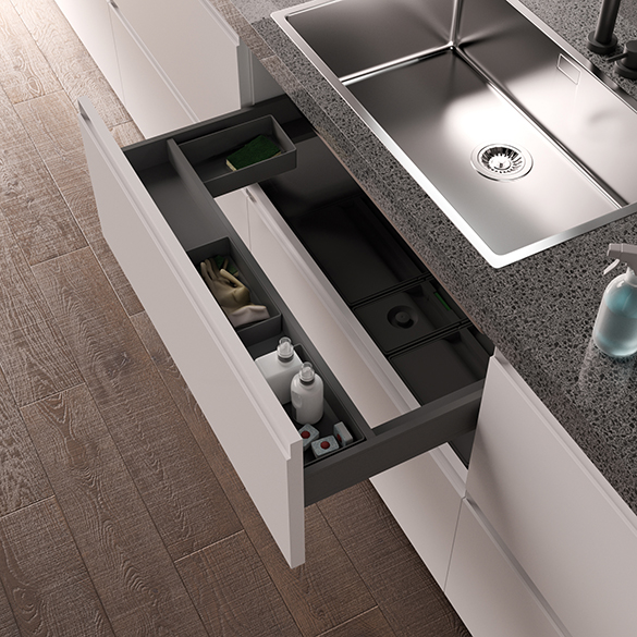 Struttura autoportante in alluminio verniciato. Studiato per i sistemi cassetto Blum Legrabox®, Blum Tandembox®, Grass NovaPro®. Disponibile in varie altezze. Adattabile ai vari tipi di largezze e di profondità. Dotato di vaschette removibili. Particolarmente adatto per abbinamenti con raccoglitori della Collezione Première e Sistema 9XL.